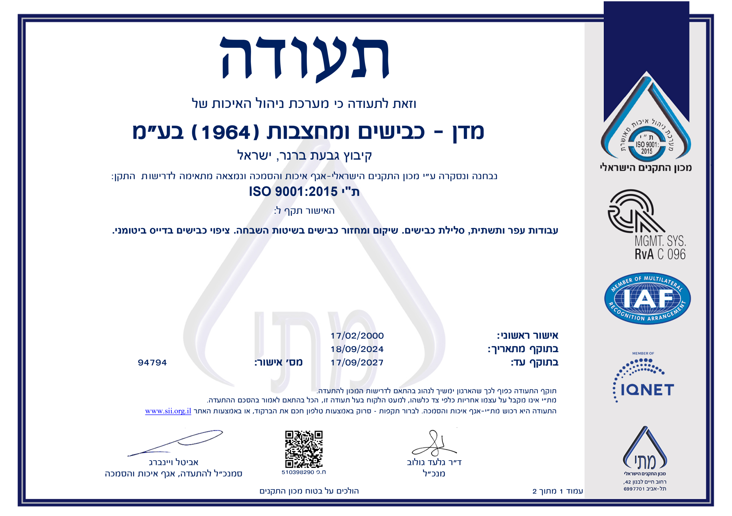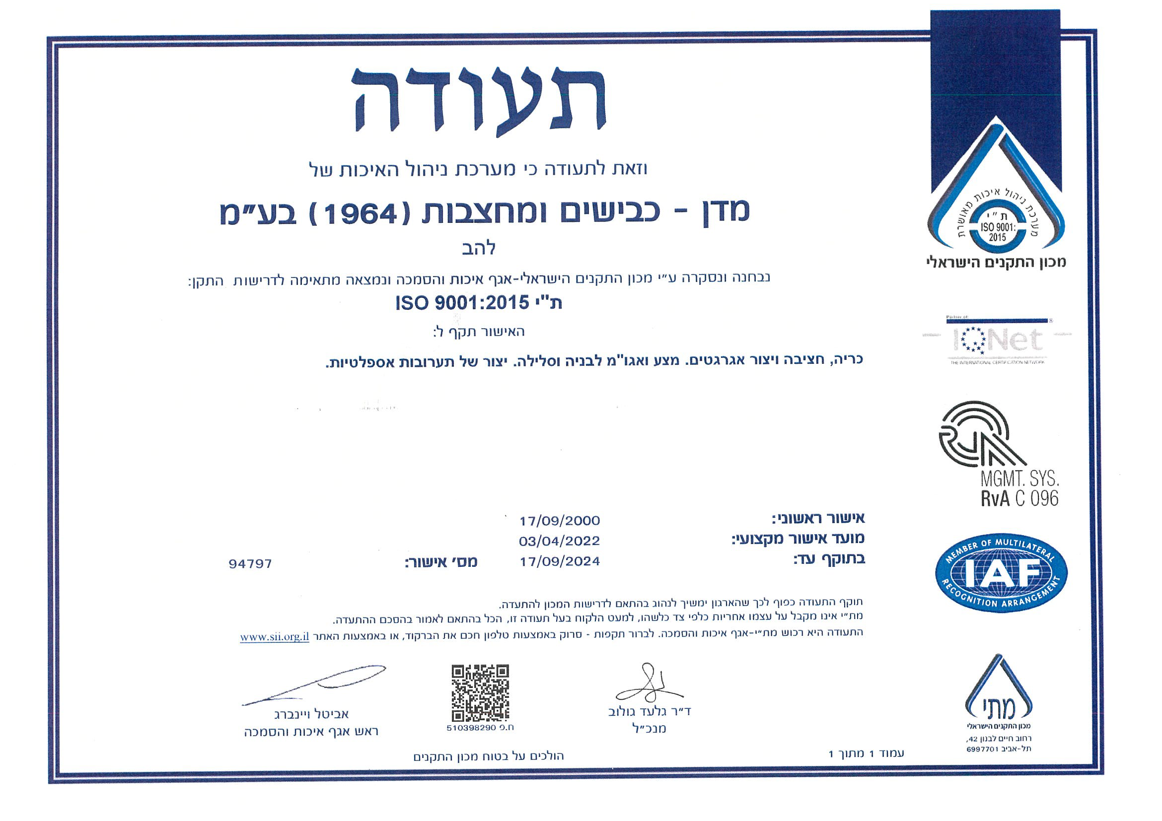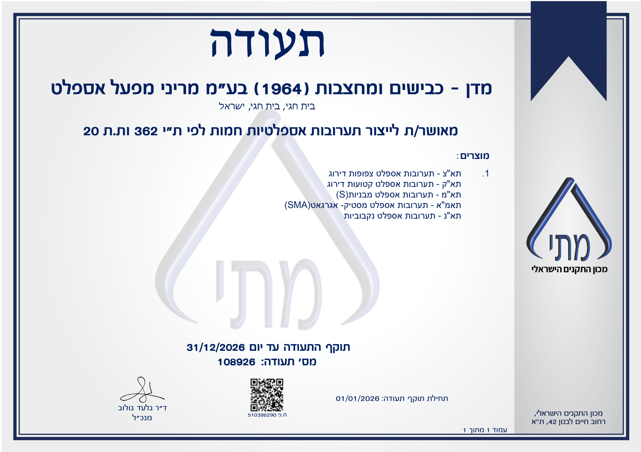 החברה רשומה ברשם הקבלנים לביצוע עבודות עפר וכבישים – בסיווג בלתי מוגבל וביצוע מערכות מים, ביוב וניקוז בסיווג בלתי מוגבל, עומדת בכל התקנים הדרושים ופועלת בהתאם לתקן־ISO.