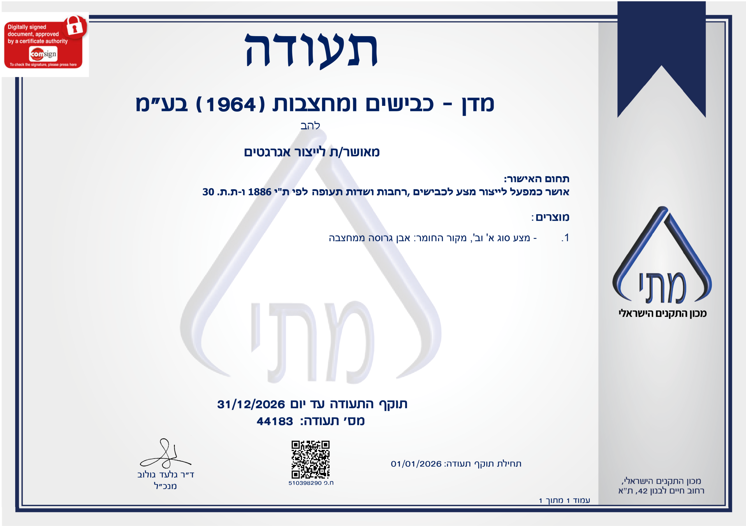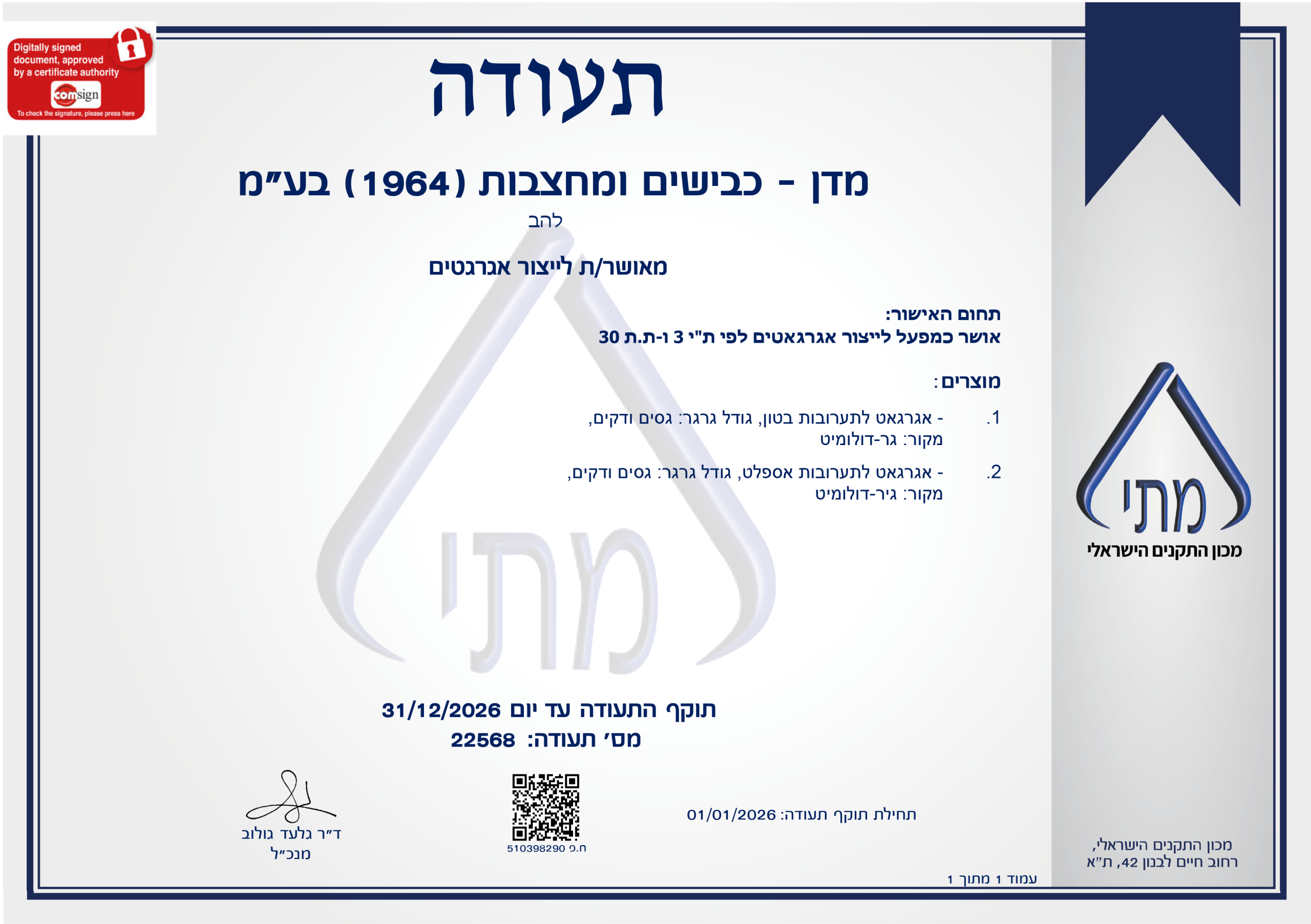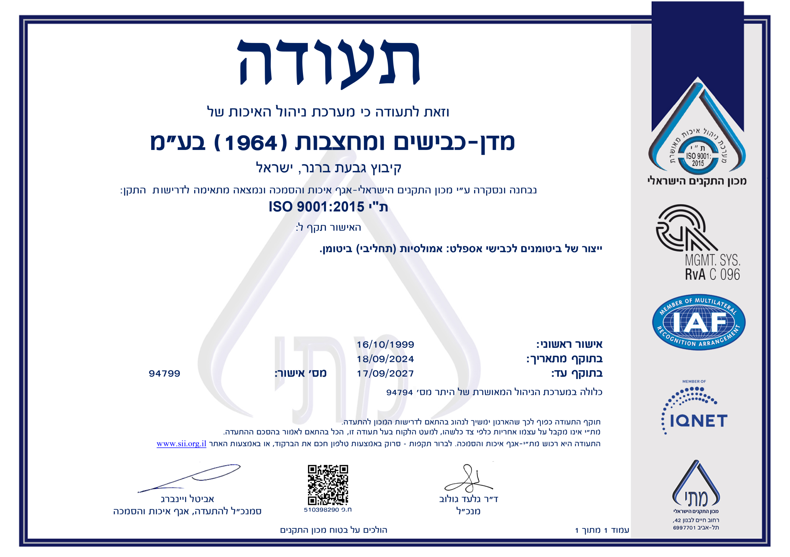החברה רשומה ברשם הקבלנים לביצוע עבודות עפר וכבישים – בסיווג בלתי מוגבל וביצוע מערכות מים, ביוב וניקוז בסיווג בלתי מוגבל, עומדת בכל התקנים הדרושים ופועלת בהתאם לתקן־ISO.